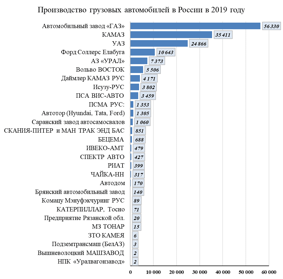 Как видно, лидируют ГАЗ, КамАЗ и УАЗ, а также «Соллерс» (который сохранил производство Ford Transit). При этом в России выпускаются и грузовики Volvo, Scania, и менее известные марки.