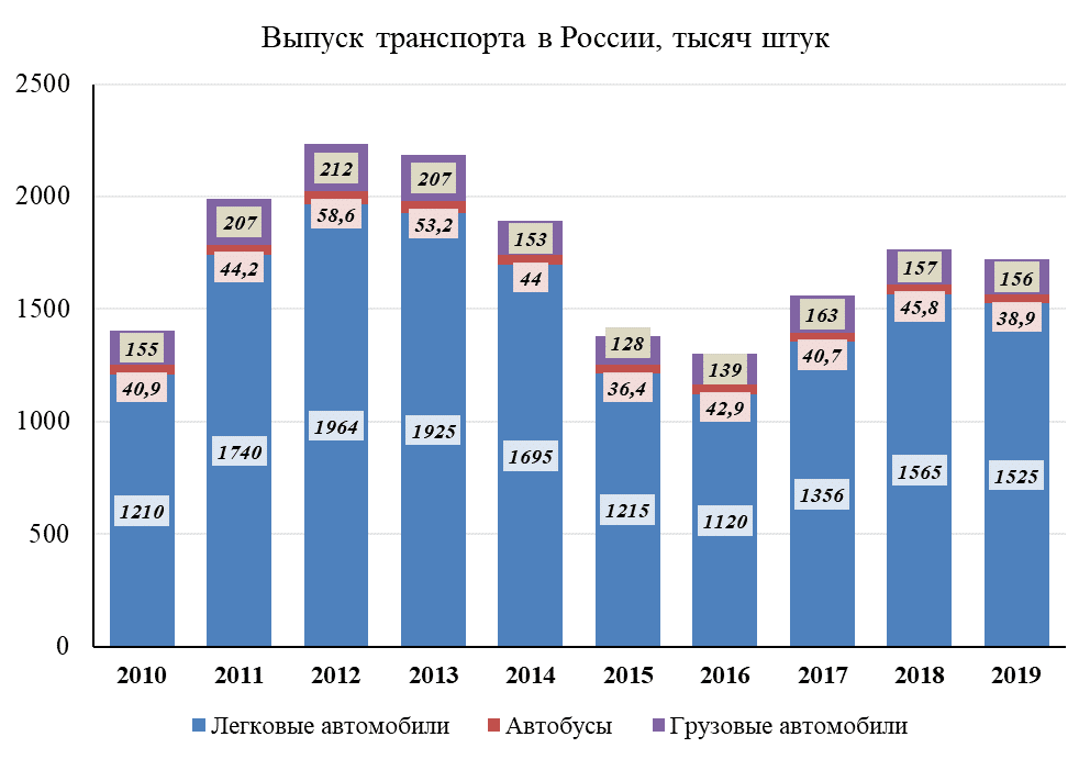 Как видно, основной пик производства приходится на последний докризисный 2013 год – тем не менее, до 2018-го автопроизводство росло. Наибольший объем, как видно, дает производство легковых автомобилей, которые уже давно стали основой автопроизводства в России – тогда как автобусов производили совсем немного. Одно из объяснений – часть автобусов (с числом мест до 9) попала в категорию легковых автомобилей.
