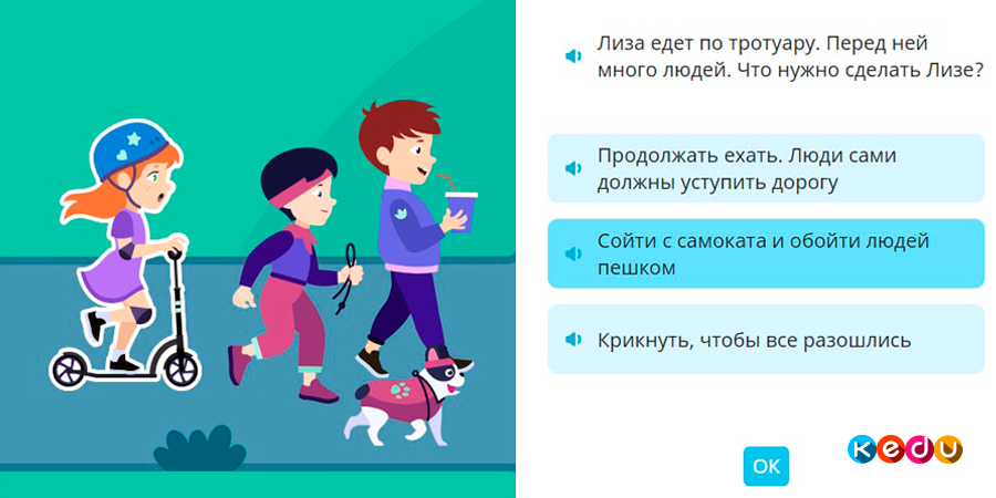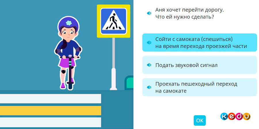 Ответ: Сойти с самоката (спешиться) на время перехода проезжей части