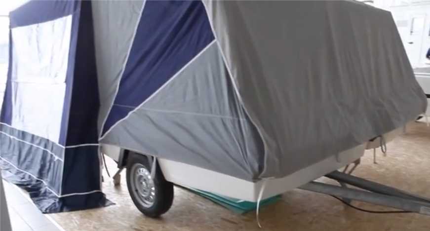 Этот тип раскладного дома на колесах. Практически все они — для летней эксплуатации, так как утепления нет. В сложенном состоянии высота прицепа чуть более метра. По количеству «комнат» и спальных мест они бывают разными. Спальные места обычно организуются в самом прицепе, а остальные помещения под тентом, который располагается на грунте. Комплектуется такой дом на колесах обычно небольшой газовой печкой и мойкой. Печка подключается к баллону с газом, вода в мойку подается при помощи маленького погружного насоса, который опускают в емкость с водой. Есть три разновидности: