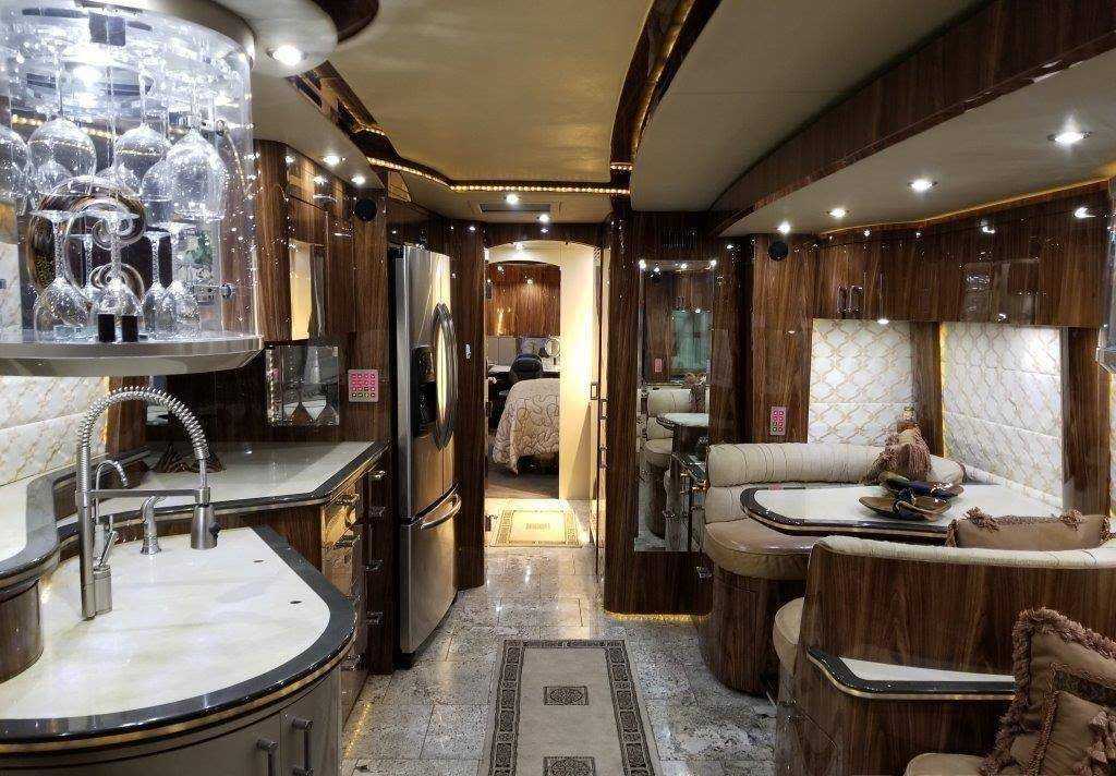 В салоне этого автобуса есть все, что необходимо для полноценного проживания в условиях не хуже, чем в гостинице премиум-класса. Просторная ванная комната, туалет, кухня, оборудованная по последнему слову техники зона развлечений, две спальни, рабочий кабинет и кладовая. Ориентировочная цена Prevost H3-45 VIP составляет порядка 1,6 миллиона долларов.