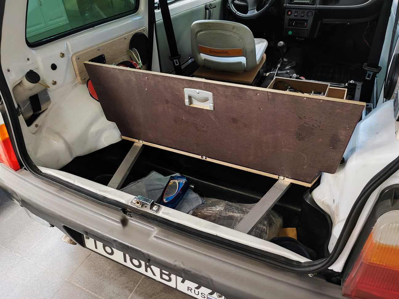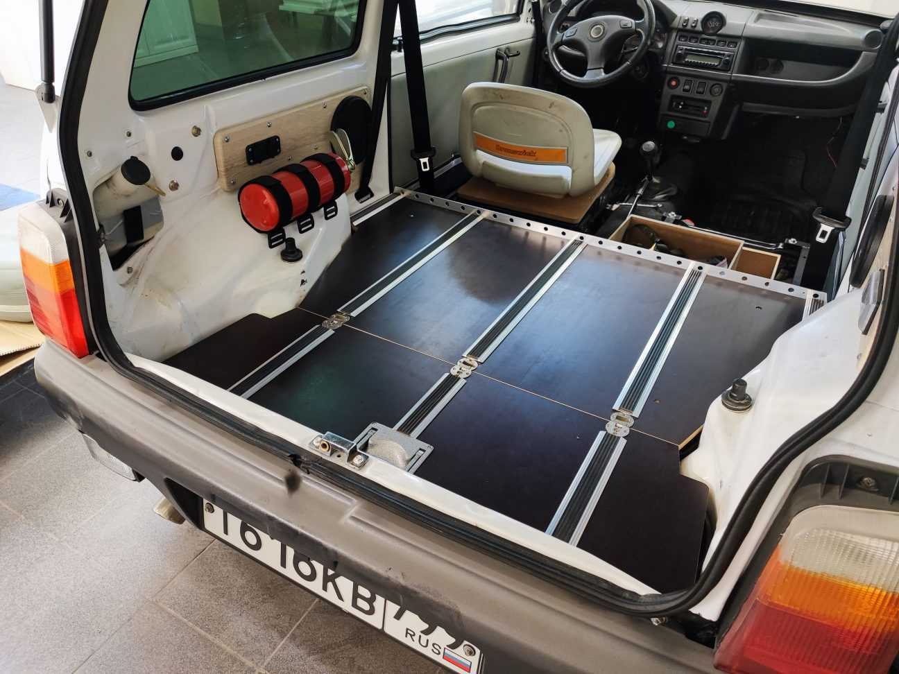 У пола багажника установил перфорированный уголок для крепления вещей при перевозке, а на бок кузова повесил огнетушитель