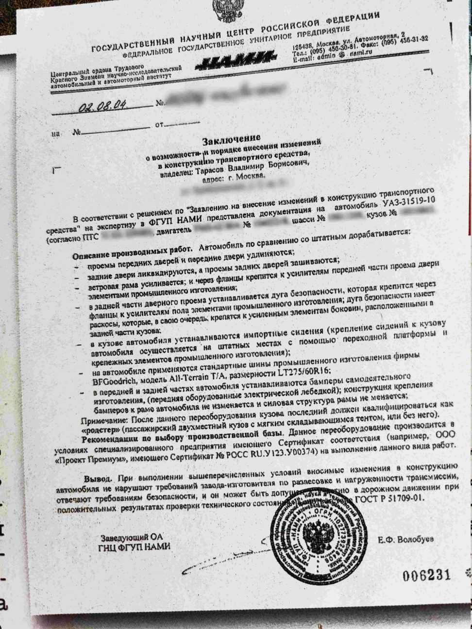Пришлось узаконить изменения в конструкции автомобиля. Для этого я обратился за экспертизой в Научно-исследовательский автомобильный и автомоторный институт «НАМИ».