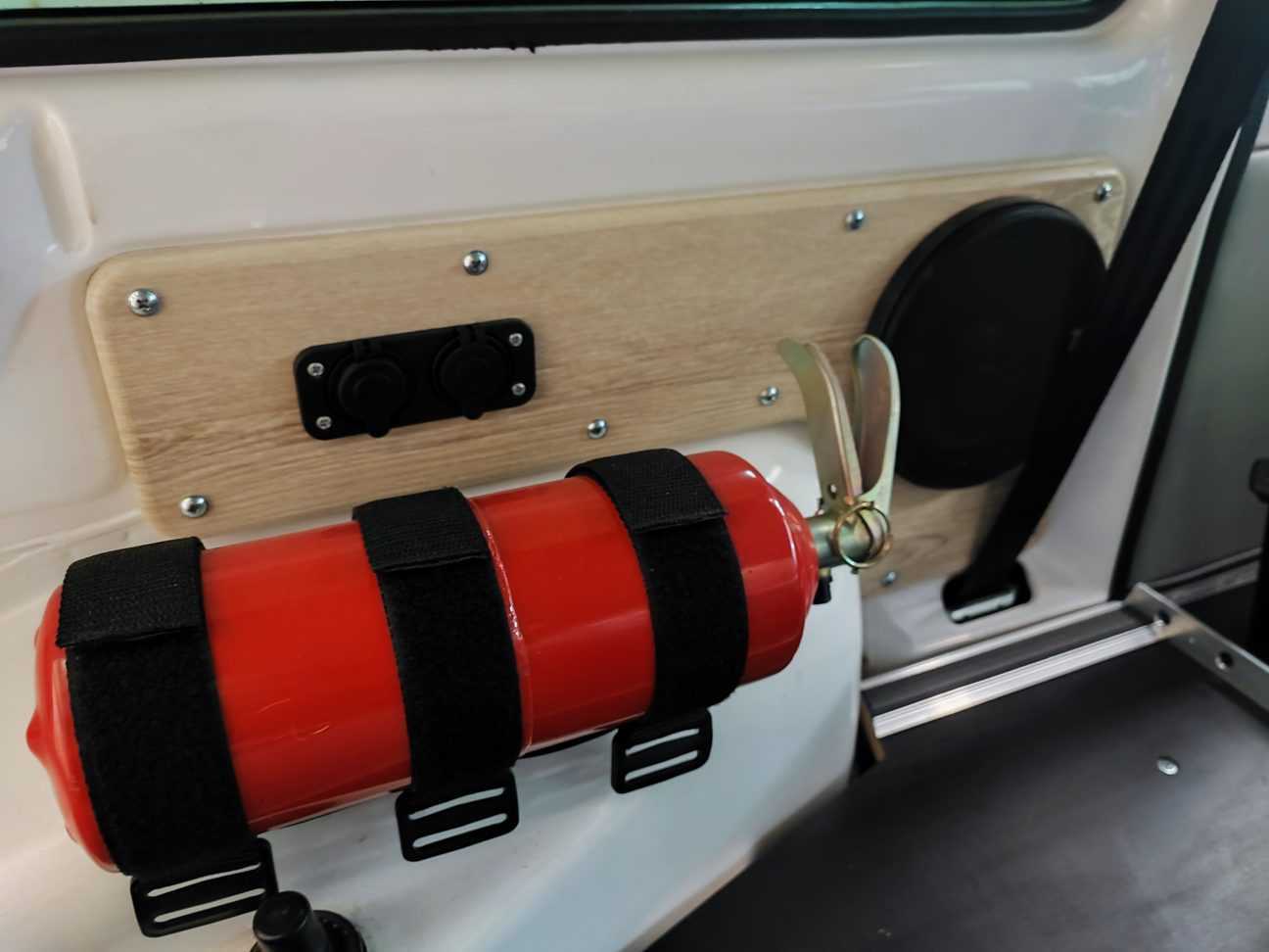 Рядом с креплением для огнетушителя сделал подиум для динамика, USB-порта и розетки 12V