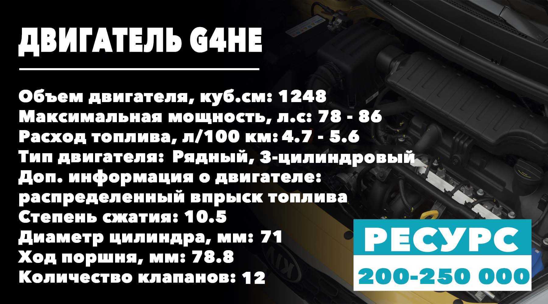 Характеристика Киа Пиканто 2 с этим бензиновым атмосферным силовым агрегатом, предусматривающим рабочий объем в 1 литр, который обеспечивается 71-миллиметровыми цилиндрами, в которых поршень ходит на 84 миллиметра. Степень сжатия, обеспечиваемая такими двигателями – 10.5 к 1. Пиковый крутящий момент достигается на 3.5 тысячах оборотов в минуту, и составляет 95 Нм. Максимальная мощность силового агрегата равна 69 л.с. Такие показатели позволяют разогнать автомобиль до первой сотни за 14.4 секунды. Максимальная скорость модели составляет 153 километра в час. При этом, потребление топлива на каждую сотню равняется всего 4.2 литрам.