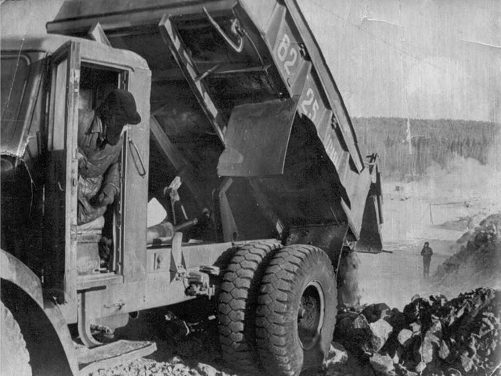 Серийный карьерный самосвал МАЗ-525 (1951-1959 — МАЗ-525; 1959-1965 — БелАЗ-525). Причины появления 25-тонного карьерного самосвала – потребность в технике, способной доставлять гранитные блоки из карьеров для строительства дамб. Существовавший на тот момент МАЗ-205 для этой цели не подходил из-за малой грузоподъемности. На машину установили снижение мощности с 450 до 300 л.с. 12-цилиндровый дизельный танк Д-12А. Задний мост, в отличие от переднего, крепился к раме жестко, без рессор, потому никакая подвеска не выдерживала ударных нагрузок, возникающих при загрузке самосвала шестью кубометрами брусчатки (кстати).