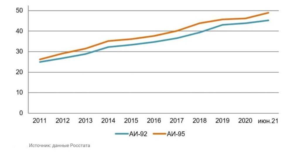 К слову, в России стоимость бензина в рублях постоянно растет, при этом в США, если смотреть в местной валюте, то цена иногда растет, а иногда падает. Вот динамика цен в России: