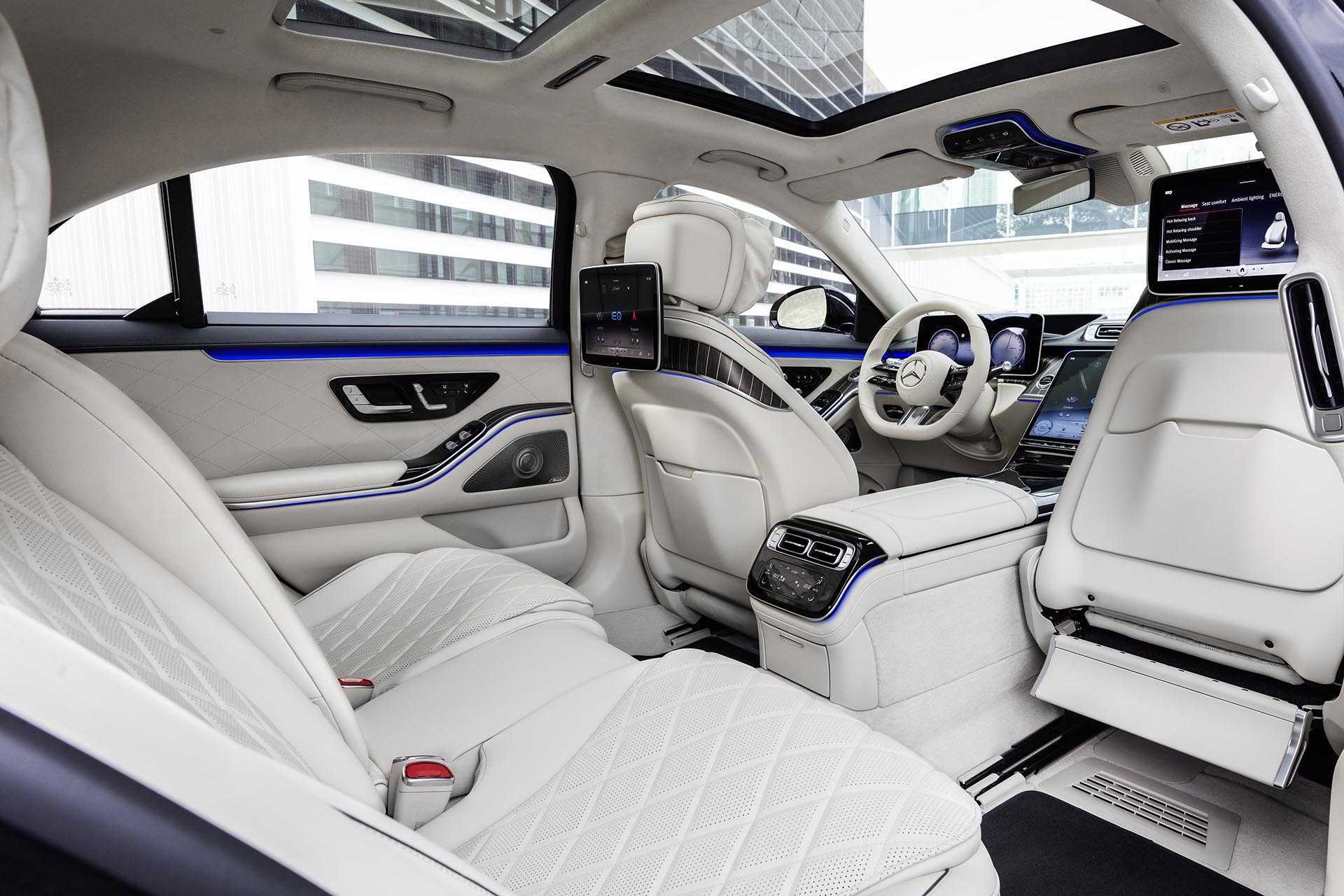 Седан настолько технологичен, что кажется космическим шаттлом, а не машиной.Селекторный джойстик переключает радио, регулирует клиренс пневмоподвески типа Air Matic, используется для выбора режима, входа в соцсети. Акустические колонки находятся даже на потолке. Передние и задние кресла – с функций массажа, вентиляцией и подогревом. Шторки поднимаются и опускаются электроприводом, эмбиентную подсветку можно настроить. И да, опционал машины легко регулируется со смартфона.