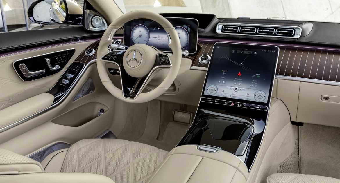 Интерьер нового Maybach S-Class отделан дорогими сортами натуральных кожи и дерева, задняя часть спинок передних сидений обрамлена деревянными панелями. В исполнении First Class выполненный из дерева декоративный элемент отделки используется в пространстве между двумя задними креслами. Для заказа доступны сиденья Executive и пакет опций «Личный водитель». Пассажир в этом случае может независимо регулировать подушку и спинку кресла.