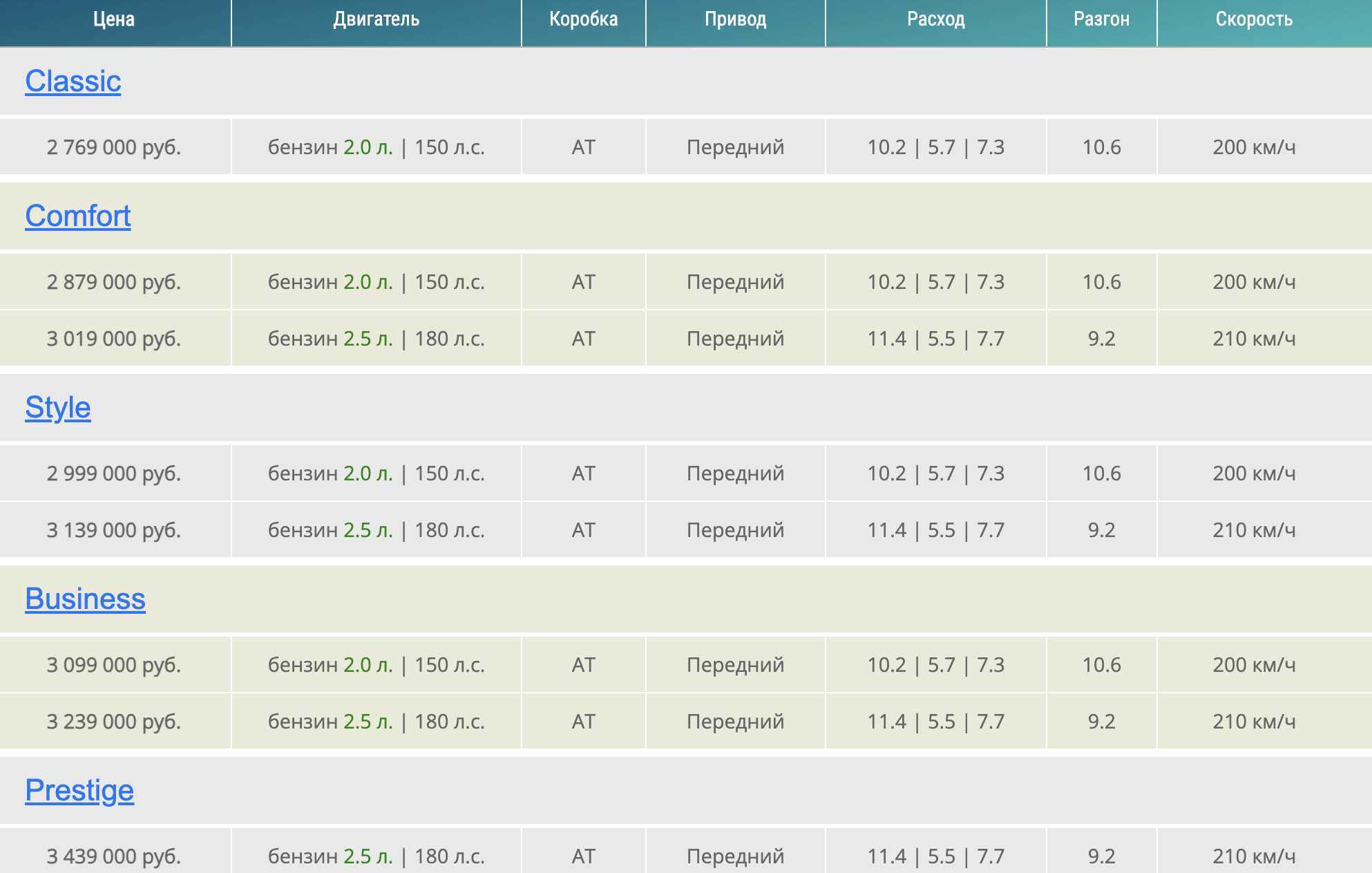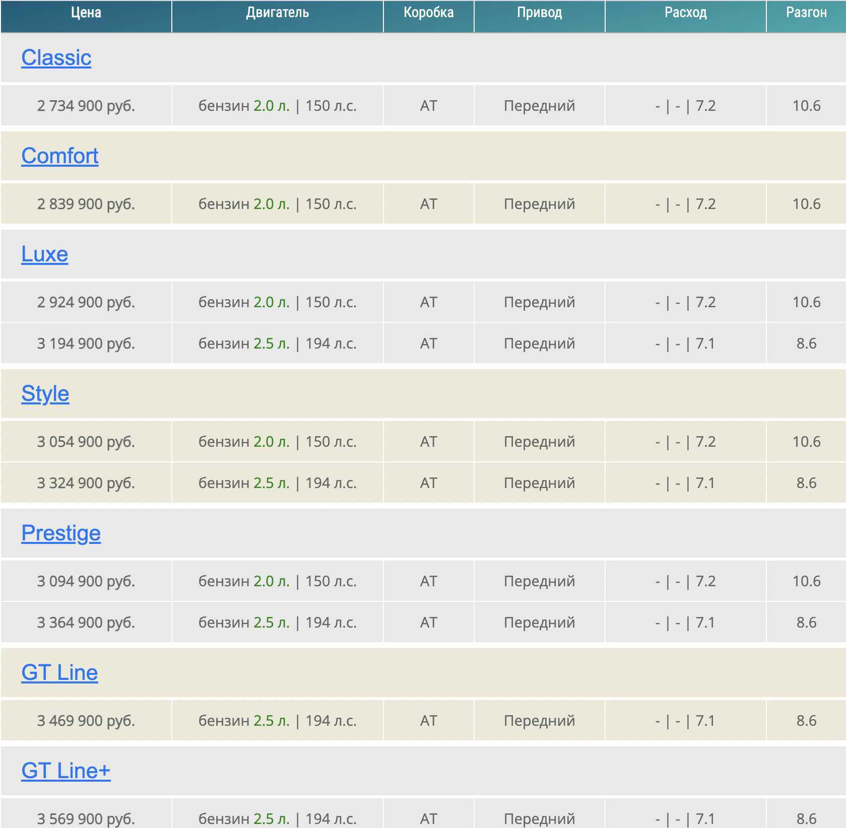 Выбирая между Kia K5 или его аналогом Hyundai Sonata, нужно внимательно изучить комплектации. Sonata представлена 7 вариантами исполнения, а цены на 2021 год были примерно такими: