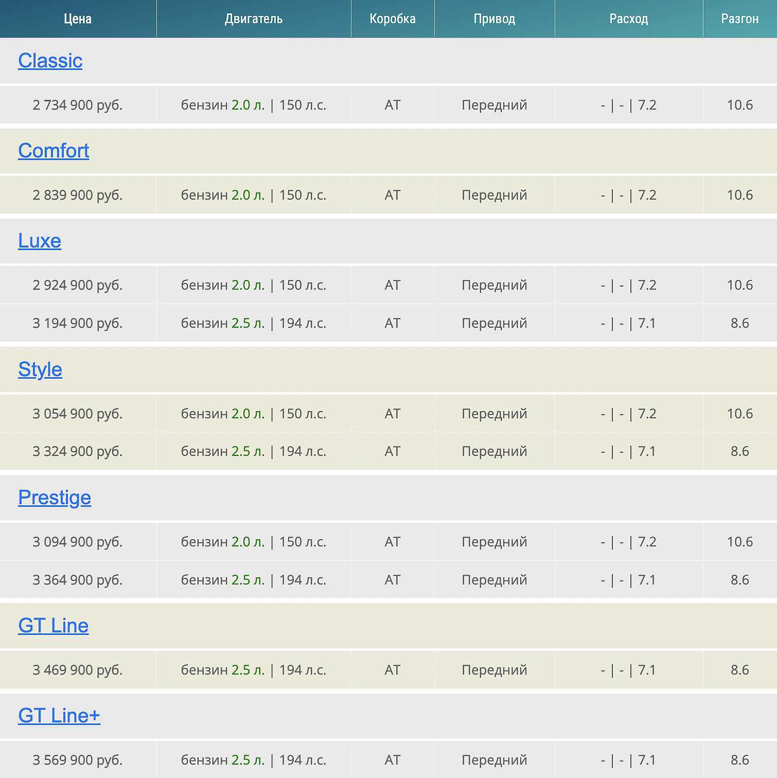 В Classic и Comfort доступен только двухлитровый двигатель со 150 силами. В комплектациях выше богаче можно выбрать 2,5 GDI со 194 лошадьми. Только в наборе базовых комплектаций есть разница: Optima не предлагала самую простую версию Classic.