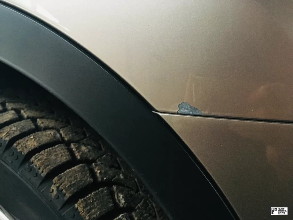 - Кузов оцинкован, соответственно имеем, как плюс это отсутствие ржавчины и как минус – краска может скалываться кусками. Например можно выделить место стыка крыла и бампера. Если бампер немного смещается, например от провисания или при любой другой причине, то будет такая картина: