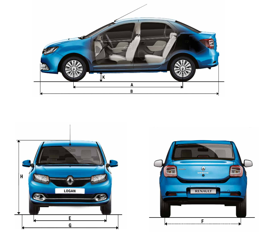 Габариты Logan 2 претерпели изменения – увеличилась длина автомобиля: теперь она составляет 4346 мм. Ширина седана уменьшилась до 1733 мм, как и высота, которая теперь составляет 1517 мм. Неизменным остался дорожный просвет — как и у предыдущей версии, он составляет 155 мм под нагрузкой.