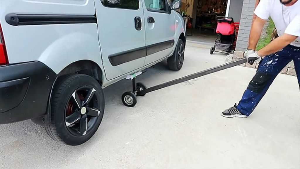 Чтобы самостоятельно переставлять колеса в гаражных условиях, необходимо обзавестись прочной подставкой – колодкой либо металлической опорой. Понадобится снимать по 2 ската одновременно, что реализовать с помощью единственного домкрата не получится. Оставшиеся колеса нужно хорошенько зафиксировать башмаками с обеих сторон, чтобы при подъеме машина не сдвинулась с места.