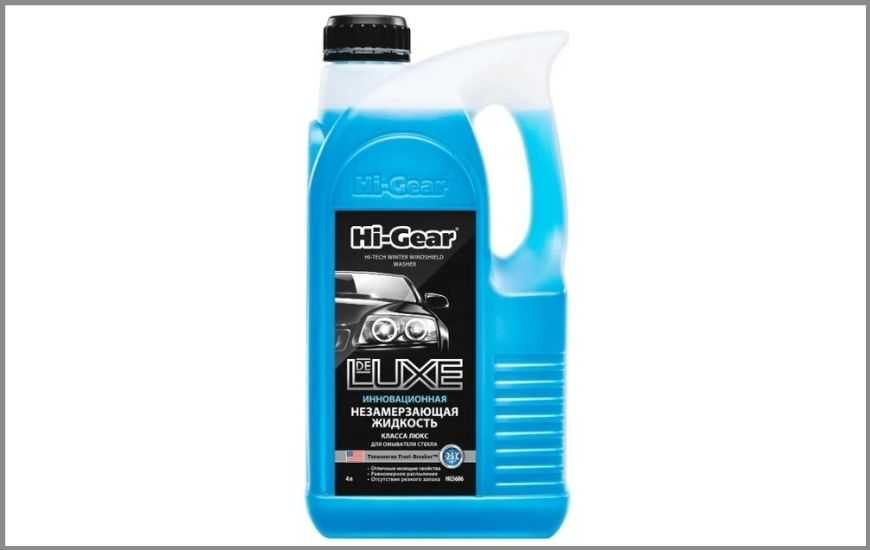 Жидкость для заправки омывателя от компании Hi-Gear на основе изопропилового спирта имеет синий цвет и выдерживает морозы до -25°C. При нанесении в салоне ощущается легкий запах мыла (интенсивность аромата зависит от конструкции системы вентиляции). Водители отмечают хорошие моющие способности, но критикуют раствор за высокую цену. Канистра имеет удобную рукоятку и длинную горловину, облегчающую процесс заливки в бачок.