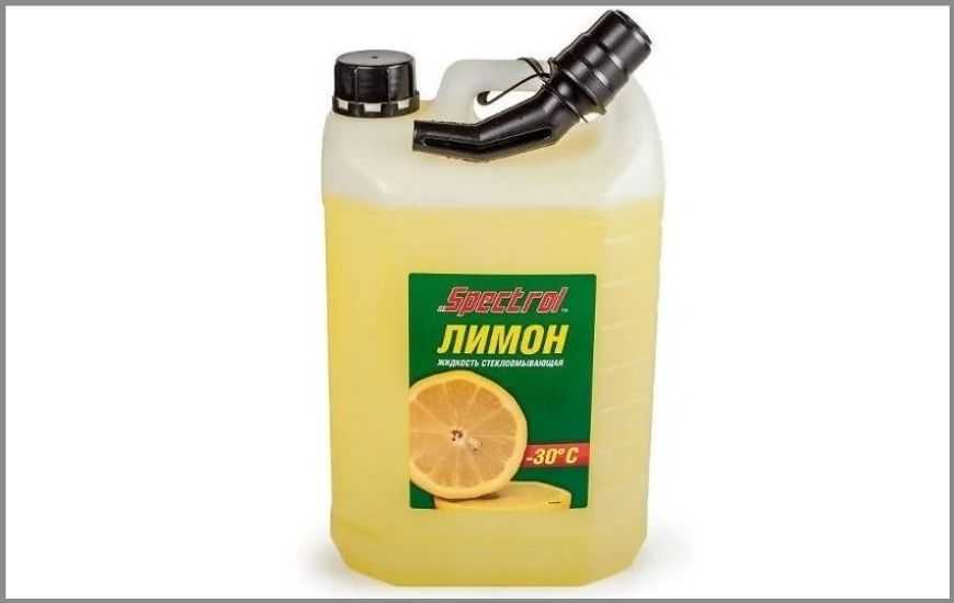 Материал Spectrol Лимон обеспечивает защиту щеток и жабо автомобиля от наледи, улучшает видимость при движении в ночное время. Поставляется в канистрах емкостью 1, 4 или 5 л, в набор входит наконечник для заливки в бачок. Температура застывания не ниже -30°С (соответствует стандарту ГОСТ 28084), чистящая способность по замерам изготовителя составляет 85%.