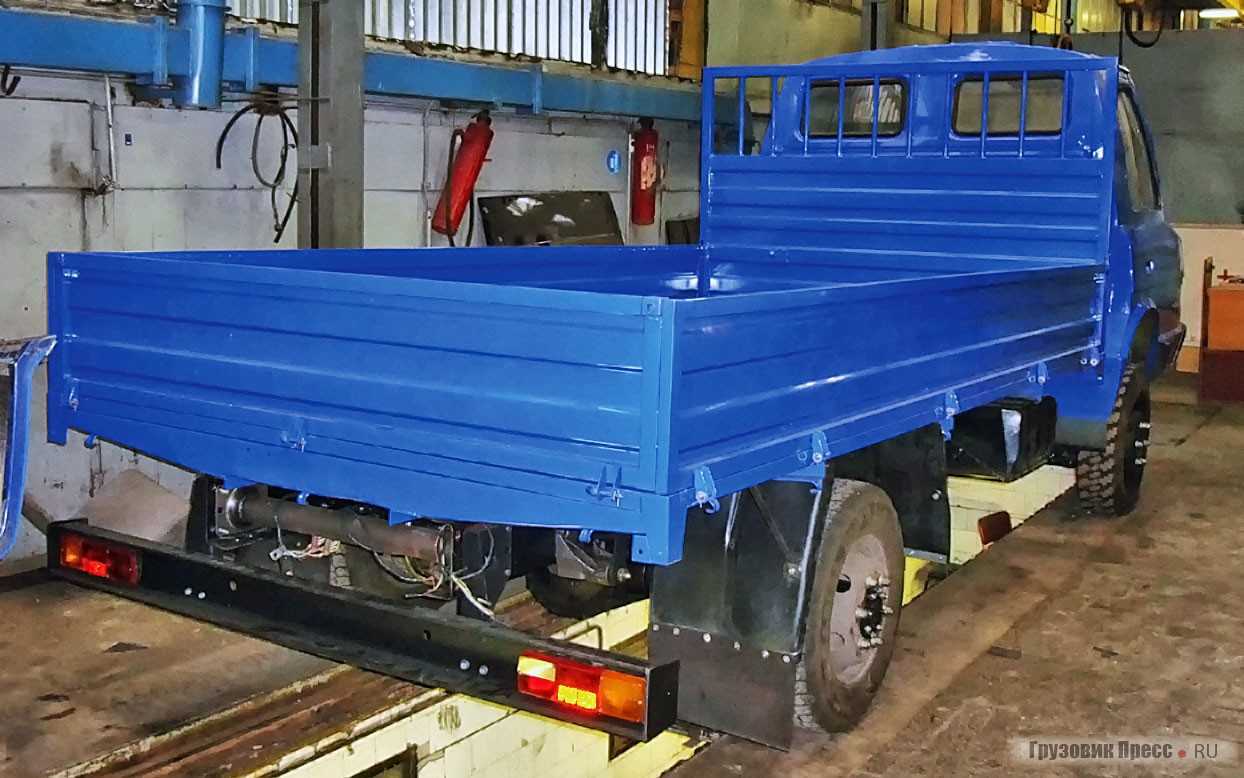 Основной отсек грузовика – бортовая платформа осталась без изменений. Она удивляла, пожалуй, только одним – деревянным настилом пола. Но главной интригой оставалась кабина. Её решили не менять, и старую 2-дверную кабину от «Юности» водрузили на новое шасси. Машину перекрасили из жёлтого в синий цвет и в таком виде показали заводскому руководству. С лёгкой руки неизвестного острослова машину прозвали «Синий енот». Шасси и компоновка устроили руководство, а вот кабина нет!