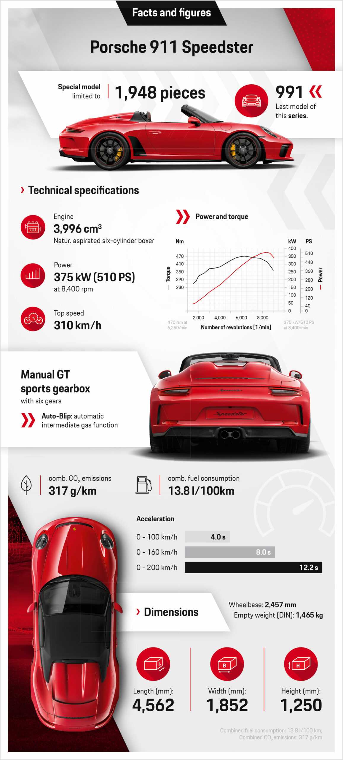 В основе долгой, изобилующей поворотами истории Speedster лежит один важный факт: двигатель у всех моделей располагался низко в задней части. Новый 911 Speedster оснащается оппозитным атмосферным двигателем с большим рабочим объемом – 4 литра. Он отличается высокооборотной концепцией, позволяющей ему раскручиваться до 9000 об/мин. Максимальный крутящий момент достигает 470 Нм. А мощность – впечатляющих 375 кВт (510 л.с.).
