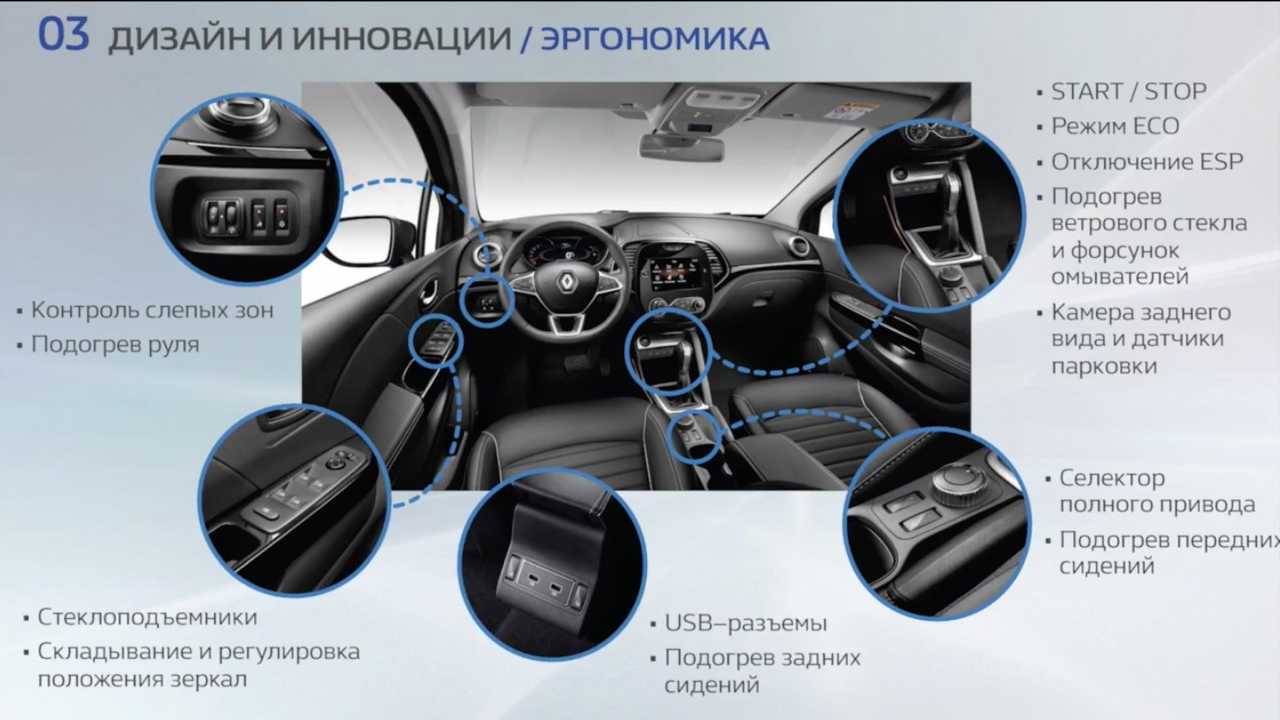 Кроме привычных опций вроде обогрева руля и сидений Renault Captur 2-го поколения получил в свое распоряжение богатейший набор систем помощи водителю. В их числе камеры кругового обзора, адаптивный круиз-контроль, автопилот второго уровня (тот же круиз-контроль, но с системой удержания в полосе), экстренное торможение (с детекцией пешеходов и велосипедистов), автоматическое переключение света фар, распознавание дорожных знаков, слежение за поперечным трафиком при движении задним ходом, парковочный ассистент с опцией Handsfree Parking (берет на себя управление рулевым колесом, а водитель манипулирует только педалями газа и тормоза).