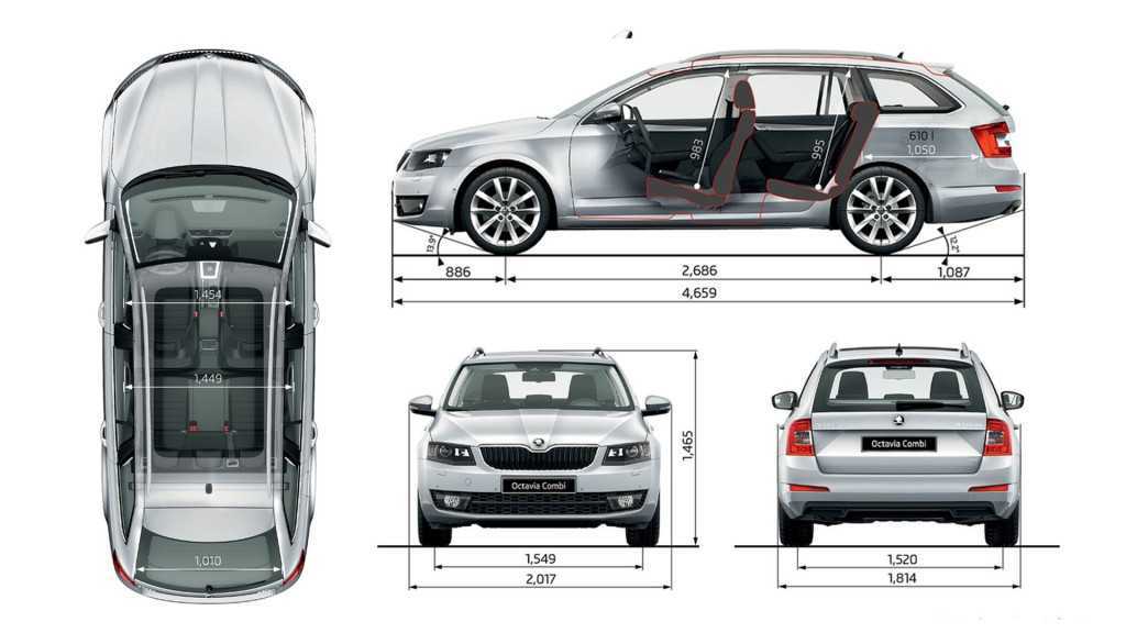 Из всех габаритов модели особенно выделяется багажник – для лифтбека его объём составляет 590 л. Можно отметить также и 160-миллиметровый клиренс – достаточно большой для своего класса. Остальные размеры, хотя и увеличившиеся по сравнению с прошлым поколением, вполне соответствуют характеристикам компактного семейного автомобиля: длина Октавии 4,67 м, ширина 1,814 м, высота 1,461 м.