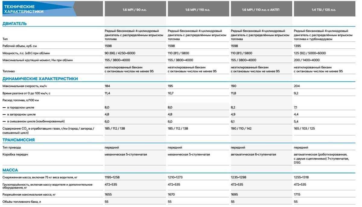 - CZCA – турбированный 1,4 TSI 125 л. с., 200 Н*м, поставляется только в связке с 7-ступенчатым «роботом» DSG-7 (двойное сухое сцепление).