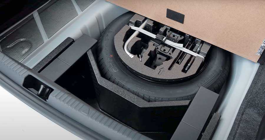 Здесь снизу имеется достаточно объемный отсек для хранения различных вещей, сверху колеса устанавливается органайзер с домкратом и инструментами.