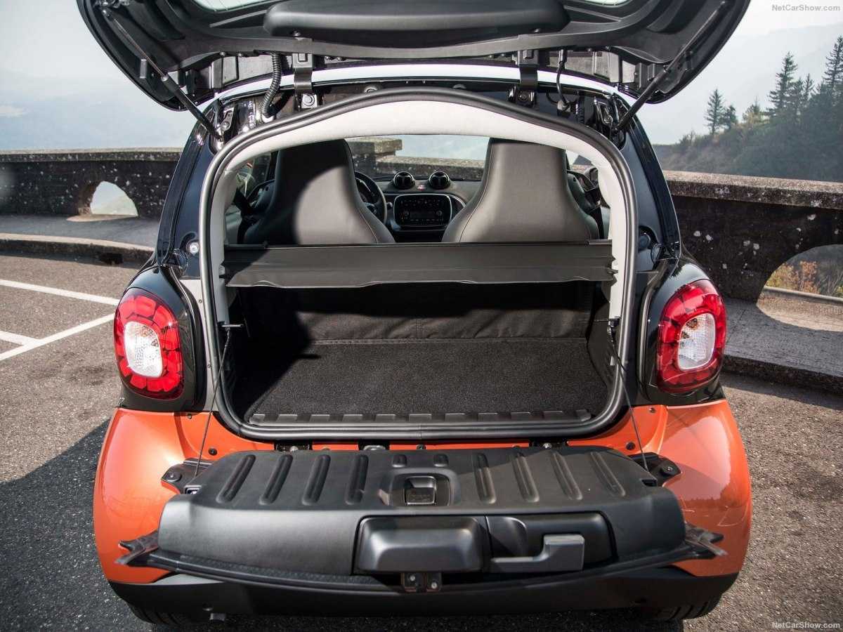 Вместительность багажного отделения 2-дверного «Смарта» составляет 260 л (+30 л сравнительно с прошлой генерацией модели), багажник 4-местного сити-кара способен вместить 185 л, а со сложенным вторым рядом кресел объем багажного отсека возрастает до впечатляющих 730 л. Помимо этого, уже в начальной комплектации авто получат складное переднее кресло.