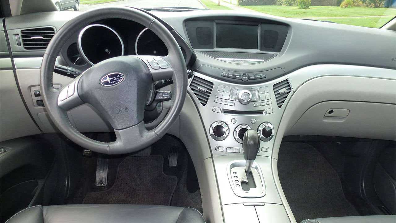 В целом оформление салона у модели является довольно оригинальным и в то же время типичным для этого японского производителя. Уже в стандартной комплектации внутренняя обивка производится с использованием качественной кожи. Очень важная для многих автомобилистов характеристика «Субару Трибека» – это оснащение руля механизмом регулировки по углу наклона. Отдельных слов заслуживает двухуровневая передняя панель, а также способ и форма расположения приборов на ней. Довольно оригинально выполнено оформление информационного монитора. В частности, его подиум не просто находится на поверхности консоли, но ещё и обтекается разделительными гнутыми линиями. Рисунок, что нанесён на «торпедо», просто так не обрывается – он продолжен на дверных картах.