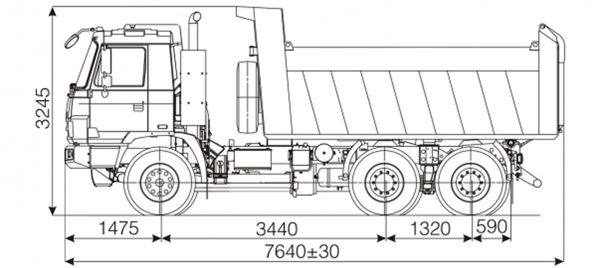 Ширина грузовик Татра 815 составляет 2,5 метра. Длина трёхосного самосвала – 7,6 м., высота (в зависимости от кузова) – от 3,1 до 3,25 м. Клиренс 300 мм. Максимальная скорость составляет 85 км/час, а расход топлива доходит до 45 литров.
