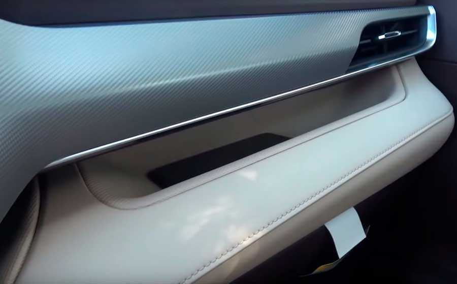 Салон коричневого цвета с кожаной отделкой. Во втором ряду можно переустанавливать раздельные кресла. Для комфорта езды и отдыха увеличилось количество портов USB, кармашков, полочек, держателей планшета и других аксессуаров. На передней панели располагается утоленный бардачок. Панель стала глянцевой и гладкой. Ее цвет можно выбрать.
