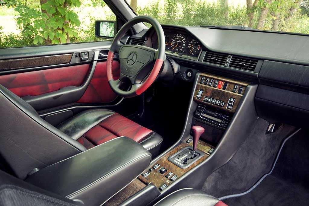 Также немцы применили более крупный бампер и расширили арки. Что примечательно: на обычной версии 124-го отсутствовали расширители арок. Бампер на «Волчке» тоже отличался от обычных 124-х. Он имеет широкие прорези для воздухозабора и оснащен противотуманками. Фары идентичны обычному «Мерсу», за исключением аккуратных дворников. Несмотря на свои угловатые формы, эта машина до сих пор гармонично смотрится в потоке. Машина построена в классическом стиле, за счет чего не стареет со временем. Также отметим, что на Mercedes-Benz W124 E500 с завода устанавливались 17- или 18-дюймовые литые диски с низкопрофильной резиной. Они разноширокие, что только прибавляет спортивности машине. Немцам удалось создать практически гоночную машину на базе обычного гражданского авто, использовав минимум доработок. Это заслуживает уважения.