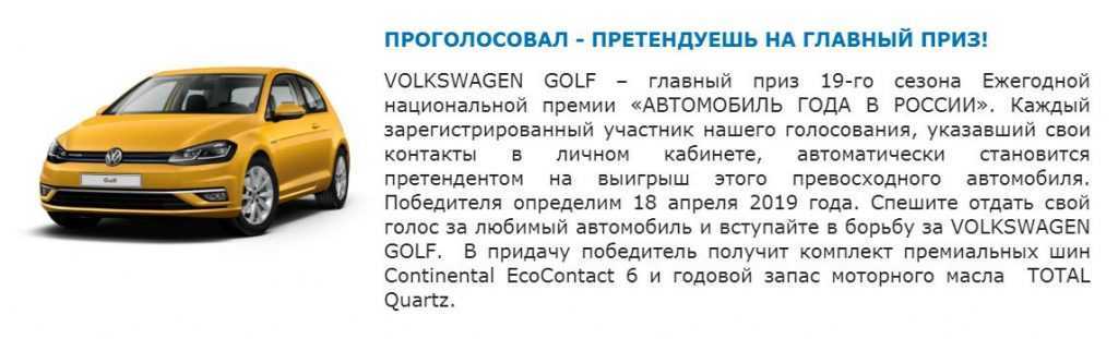 Главный приз получит один победитель. Это автомобиль Volkswagen Golf. Помимо этого победитель получит комплект премиальных шин Continental EcoContact 6 и годовой запас моторного масла TOTAL Quartz.