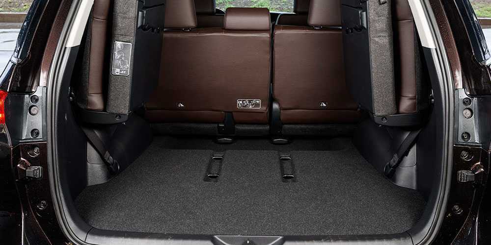 Кресла расположены в 3 ряда. Третий ряд легко снимается. Багажник вместителен и просторен. Сиденья очень удобны — владельцы Тойоты Фортунер 2019 отмечают, что не чувствуют никакого дискомфорта после утомительных поездок на большие расстояния по междугородным трассам.