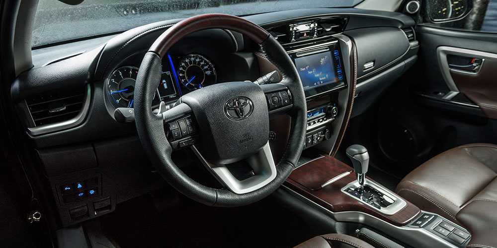 Как и ожидалось внутренне убранство внедорожника имеет много общих черт с соплатформенной моделью Hilux (например, приборку и рулевое колесо), но в новом Fortuner разработчики постарались подчеркнуть его более высокое положение по отношению к утилитарному пикапу. Качество материалов отделки стало на порядок выше (в топовом исполнении салон обшит кожей), появилась новая мультимедиа с 7-дюймовым тачскрином, число доступных штатно «аэрбегов» увеличили до семи. Перечень доступного оборудования расширился за счет камеры заднего вида, электроприводной крышки багажника, системы доступа в салон без ключа, воздуховодов климатической системы для 3 ряда кресел, розетки на 220V, спутниковой навигации и пр.