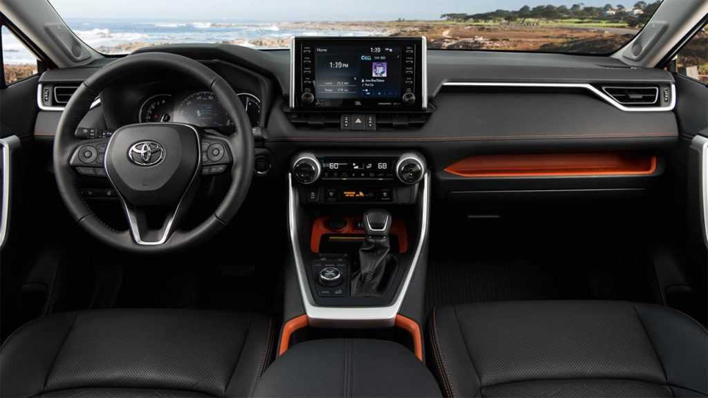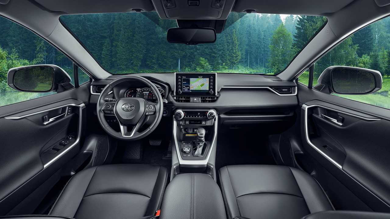 В интерьере новинки компания Тойота не стала выполнять значительные изменения. Салон по-прежнему характеризуется комфортом и эргономикой. В передней части привлекательно смотрится многофункциональный руль и прямая центральная консоль с надстроенным сенсорным монитором. Панель приборов исполнена в цифровом варианте и защищена особым противобликовым козырьком. На массивном переднем тоннеле смонтированы клавиши управления трансмиссией и размещена площадка беспроводной зарядки, а сам тоннель переходит в большой подлокотник с вещевой нишей. Все сиденья получили новую более удобную конструкцию, при этом у спинок задних кресел можно изменять наклон. При складывании в соотношении 2/3 образуется ровная площадка багажного отделения.