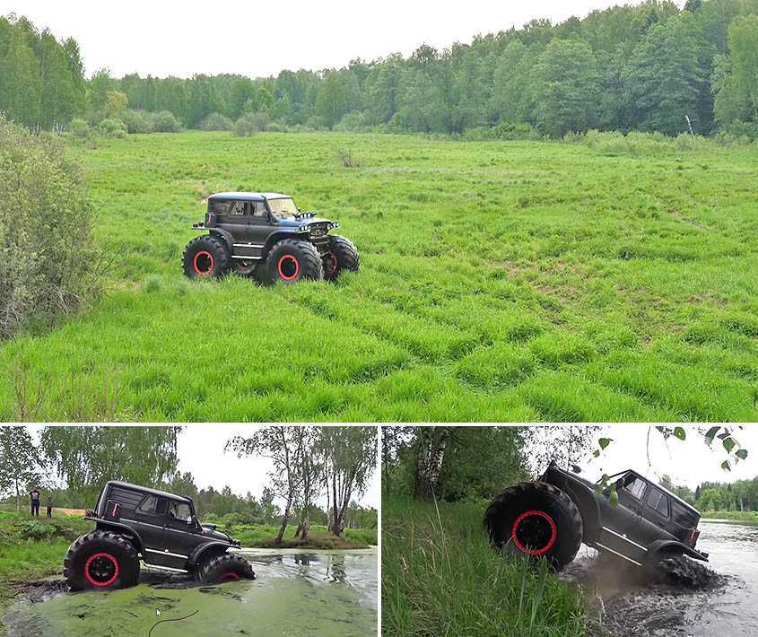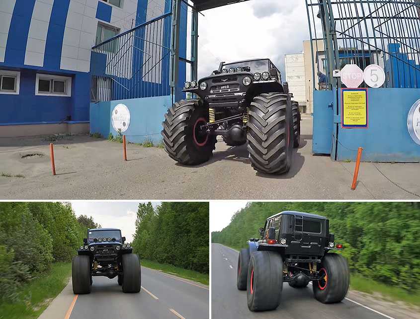 При этом двигатель на необычном внедорожника от стандартного УАЗа, из-за чего динамика трехтонной машины вызывает определенные вопросы. Впрочем, вряд ли кто будет кататься на таком автомобиле по дорогам общего пользования (да и не факт, что машина получит соответствующее разрешение).