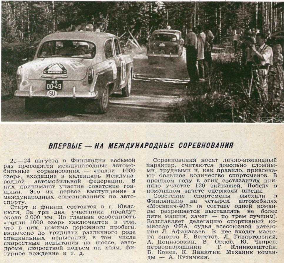 Позднее были также построены автомобили «Шахтер» и «Шахтер-2», в советском автоспорте участвовали «ЗИС-112» и «Москвич-404». Вскоре СССР стали участниками Международной автомобильной федерации FIA. И уже в 1958 году советские спортсмены дебютировали на Ралли «1000 озер» в Финляндии, это был первый случай выступления автоспортсменов СССР за рубежом. Новый автомобиль «Москвич-407» занял третье командное место.