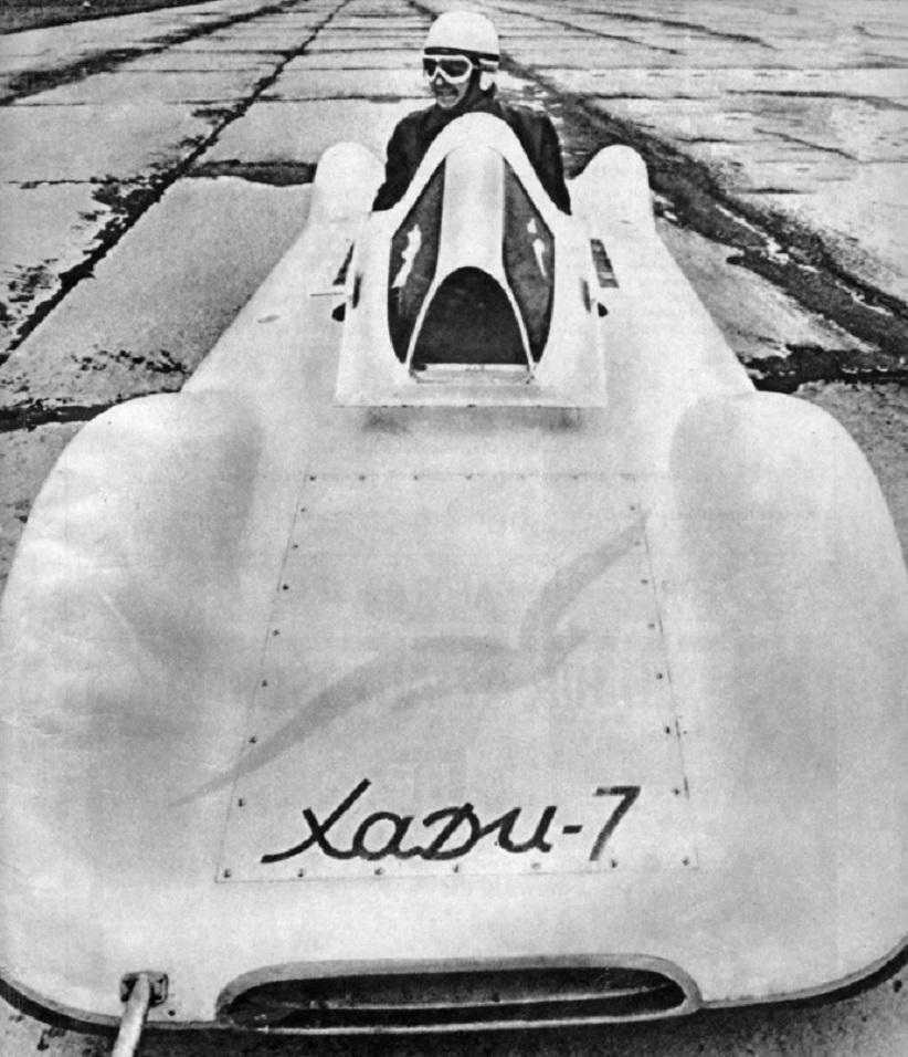 А в 1951 году уже отличился Харьков. ХАДИ (Харьковский автодорожный институт) построили ряд экспериментальных автомобилей «Харьков» для того, чтобы бить рекорды скорости. Например, вот болид «ХАДИ-7» на советской марке.