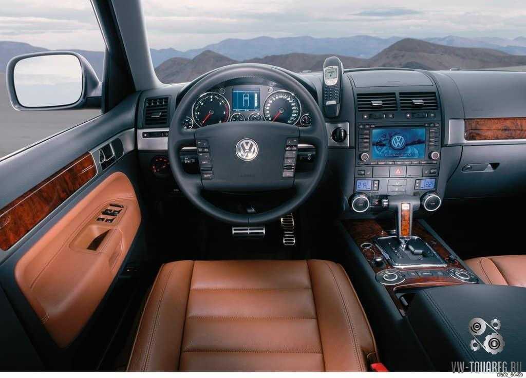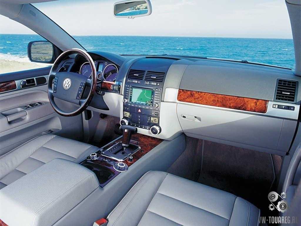 Многие водители отмечают, что первый Touareg напоминает бизнес-класс в самолете по уровню комфорта и оснащения салона. Он имеет изысканный, эргономичный интерьер с дорогими материалами отделки и отличной звукоизоляцией. Кожа хорошо сочетается с деревянными и алюминиевыми вставками и мягкими пластиками.