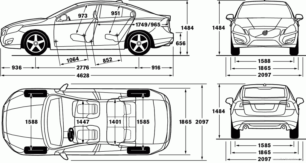 Габаритные размеры Вольво S60 II таковы: в длину он 4,635 м., в ширину -1,865 м., высота насчитывает 1,484 м., а колесная база равняется 2,776 м. Клиренс Volvo S60 весьма мал -13,6 см.
