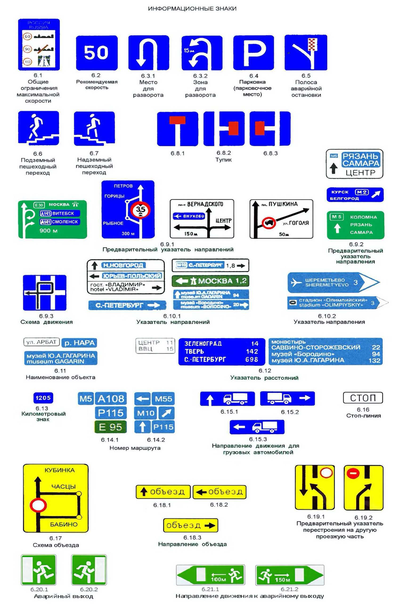 Информационные знаки извещают участников движения о месторасположении населенных пунктов, а также о вводе обязательных или рекомендуемых режимов движения. Знаками этого типа водители и пешеходы информируются о местонахождении пешеходных переходов, расположении улиц, городов и сельских поселений, остановок, рек, музеев, гостиниц и т. д.