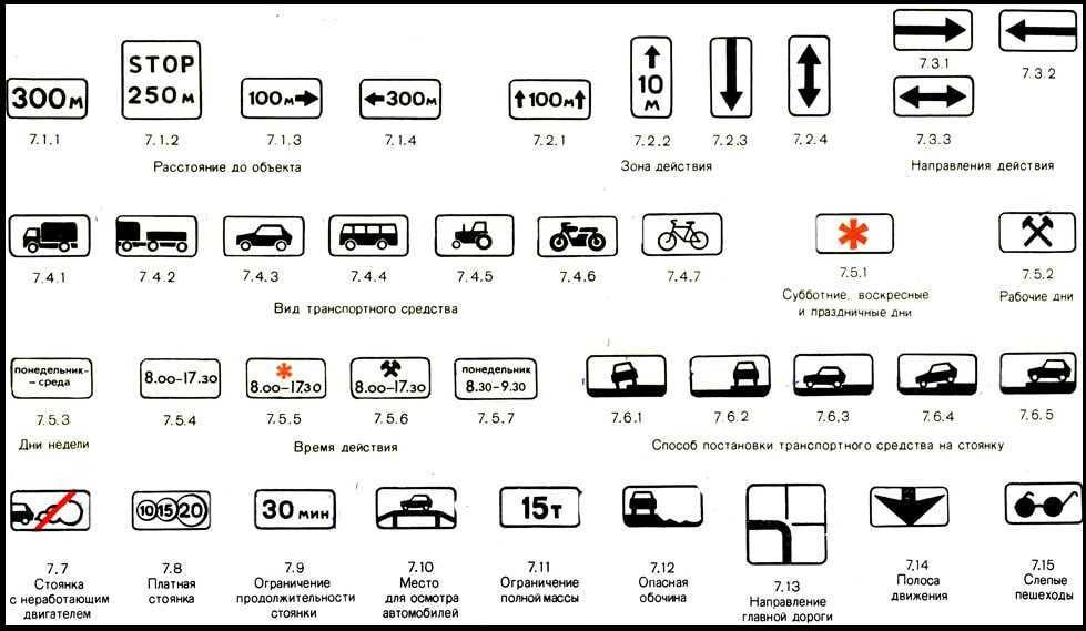 Используются вместе с основным знаком. Назначение табличек – ограничение действия либо уточнение основного дорожного знака. Также таблички могут содержать дополнительную информацию, важную для участников движения.