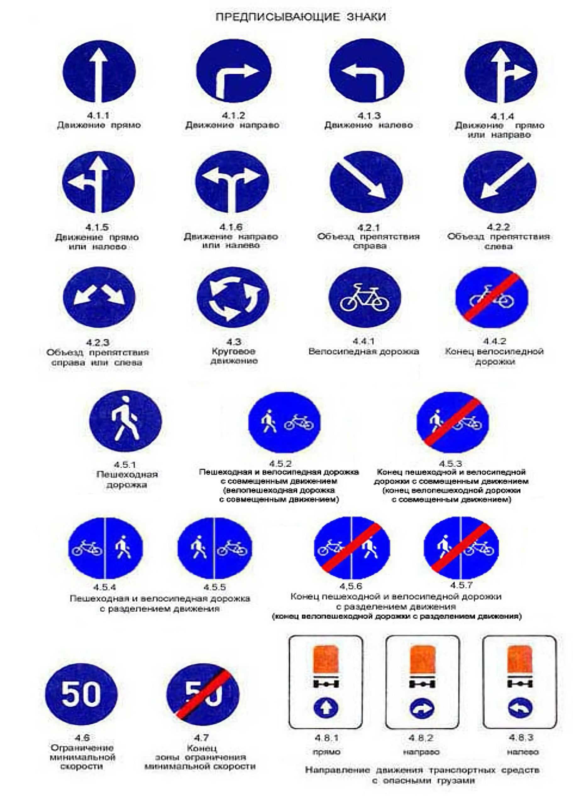 Эти знаки дают водителю указания, обязательные для исполнения. Они могут предписывать определенные направления движения, минимальную допустимую скорость, разрешать дальнейшее движение только пешеходам и велосипедистам, указывать путь транспортным средствам, перевозящим опасные грузы.