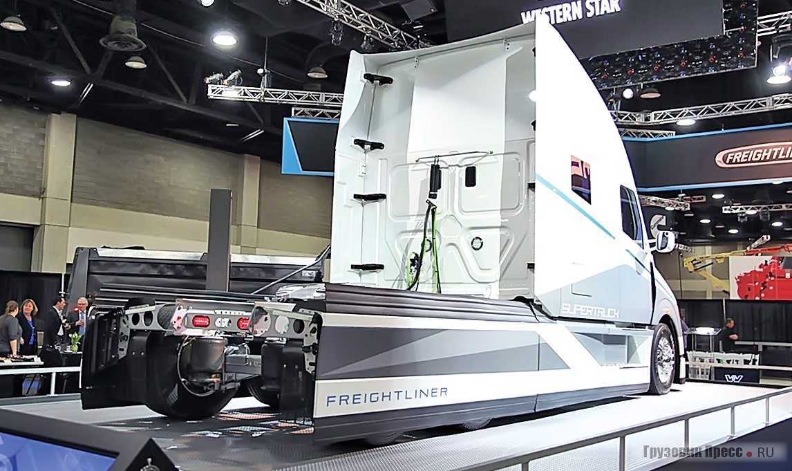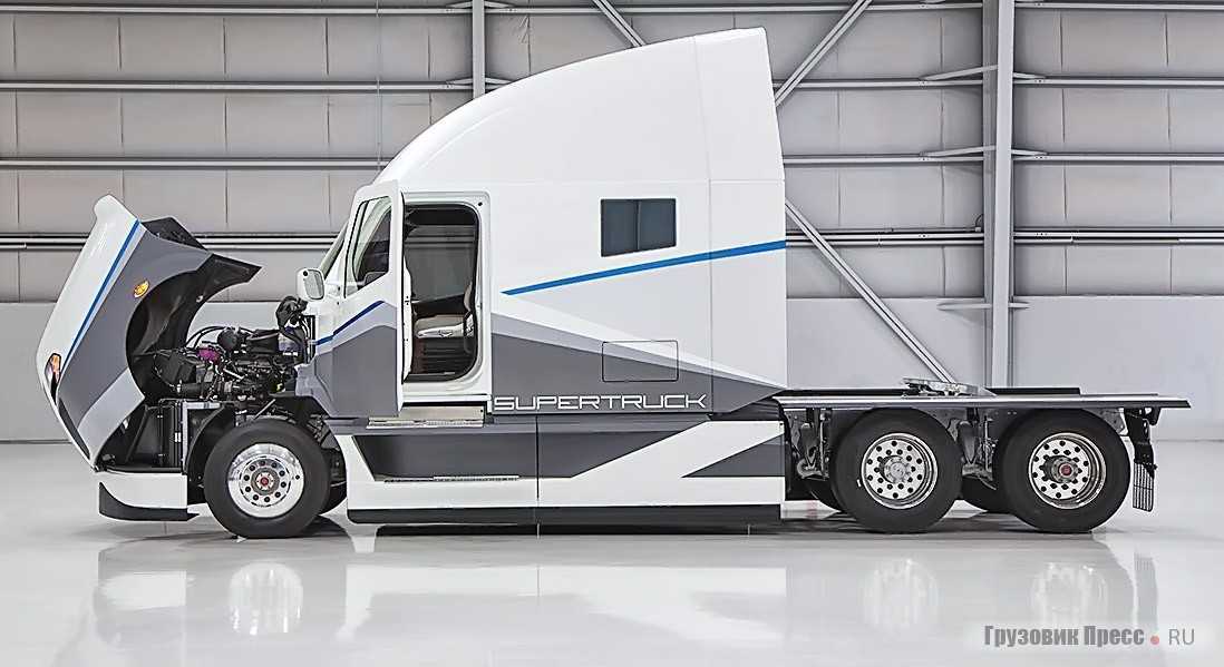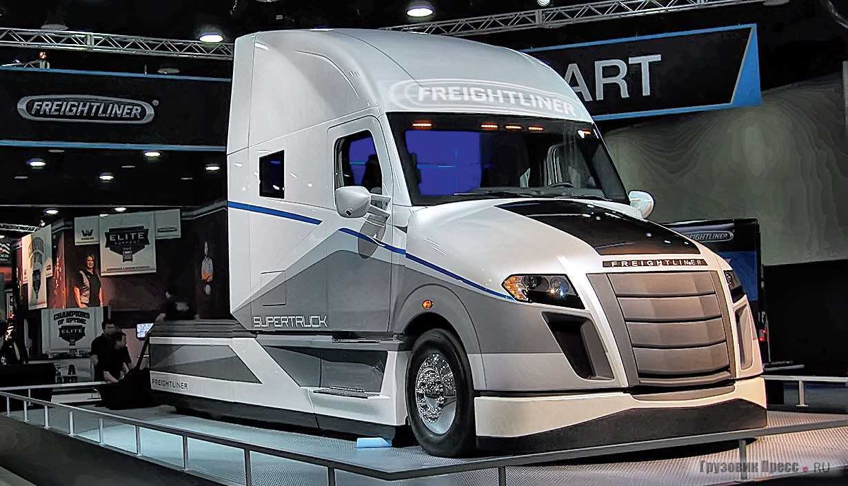 Компания Freightliner Trucks представила свой новейший концепт – магистральный тягач SuperTruck. В этом проекте американские инженеры применили множество инновационных автомобильных технологий и аэродинамических элементов. Комбинация этих составляющих и дала в итоге самый настоящий SuperTruck. Основное его отличие от серийных машин – это бескомпромиссная аэродинамика. Она полностью доминирует. Всё подчинено идее уменьшить воздушное сопротивление всего транспортного средства. Бампер, капот, крылья, кокпит с ветровым стеклом и спойлер – всё это образует единое тело кабины очень обтекаемой формы. Новаторски выглядят решётка радиатора со встроенными поворотными жалюзи. Их меняющийся угол способен регулировать поток воздуха к двигателю, а также способствовать снижению лобового сопротивления воздуха. Идеальную аэродинамическую форму капотного грузового автомобиля дополняют боковые отражатели, установленные по обеим сторонам шасси, и дефлекторы, закреплённые на тыловой панели кабины.
