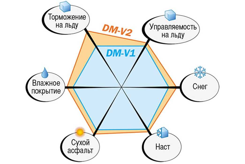 Улучшение характеристик DM V2 заметно по всем параметрам по сравнению с предшественницей. На диаграмме ниже можно посмотреть все преимущества, которые дает новое поколение шин.