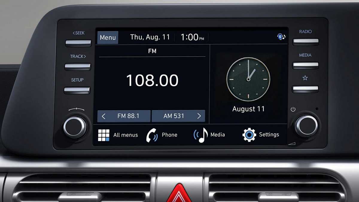 Оригинально смотрится компоновка консоли Хендай. На верхней панели – монитор мультимедийной системы. Экран имеет сенсорные датчики и обучен воспроизводить видеофайлы, показывать карту местности или картинку с камер кругового обзора. Под дисплеем установлен блок климат-контроля, а по бокам – дефлекторы обдува, отделанные деревянными вставками.