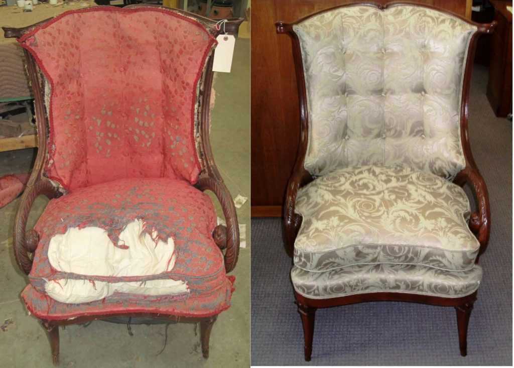 - Перетяжка. Этот вариант необходим, если старая обивка износилась и требует замены. Старая ткань удаляется, и на ее место натягивается новая, причем это может быть вариант другого цвета, что сразу изменит внешний вид кресла.