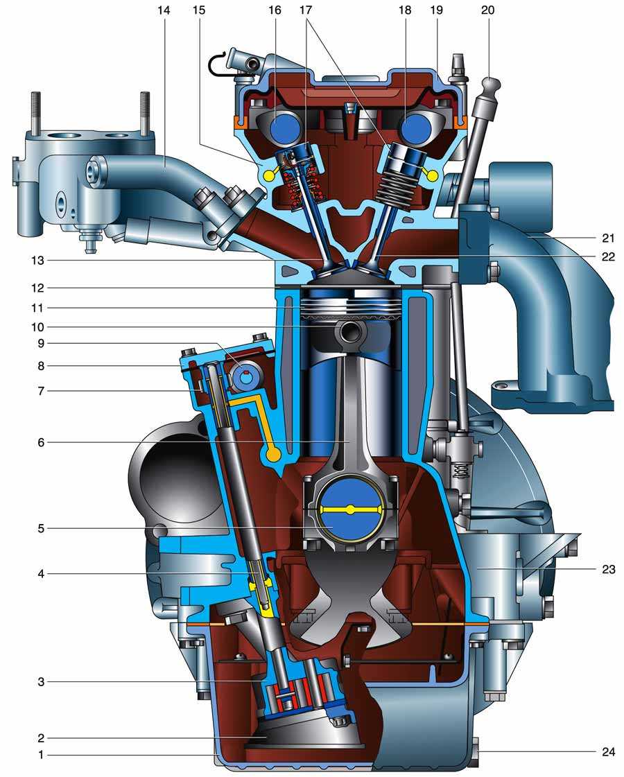 Поперечный разрез двигателя: 1 – поддон картера; 2 – маслозаборник; 3 – масляный насос; 4 – валик привода масляного насоса; 5 – коленчатый вал; 6 – шатун; 7, 9 – ведомая и ведущая шестерни привода масляного насоса; 8 – крышка привода масляного насоса; 10 – поршневой палец; 11 – поршень; 12 – прокладка головки блока цилиндров; 13 – впускной клапан; 14 – впускной трубопровод; 15 – головка блока цилиндров; 16 – распределительный вал впускных клапанов; 17 – гидротолкатели; 18 – распределительный вал выпускных клапанов; 19 – крышка головки блока цилиндров; 20 – масломерный щуп; 21 – выпускной коллектор; 22 – выпускной клапан; 23 – блок цилиндров; 24 – пробка сливного отверстия.