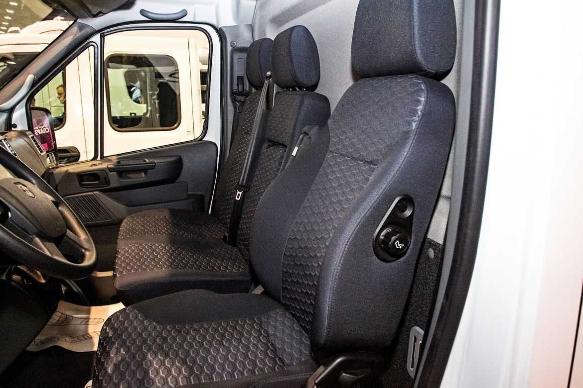 Внутри кабины установлено два сидения (для водителя и пассажира). Оба они имеют анатомическую поддержку и 5 уровней регулирования. Дополнительный плюс сидений — наличие специальной подпорки в области поясничной зоны.