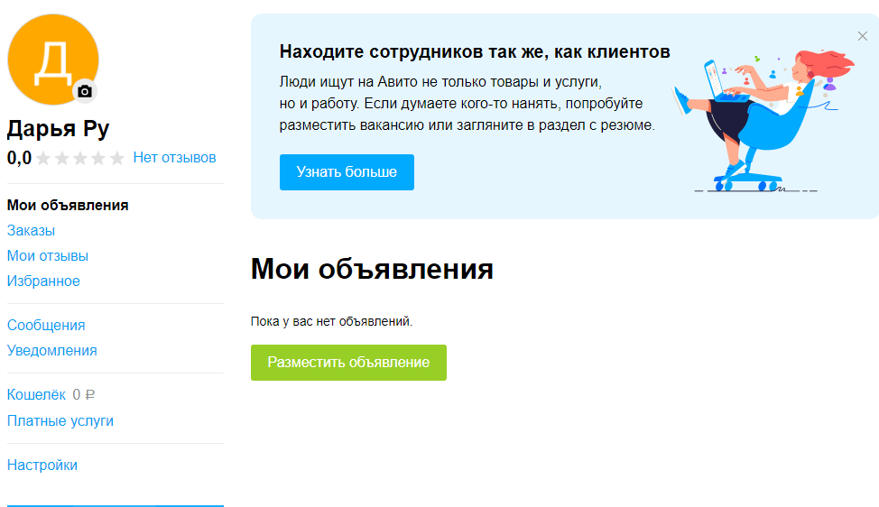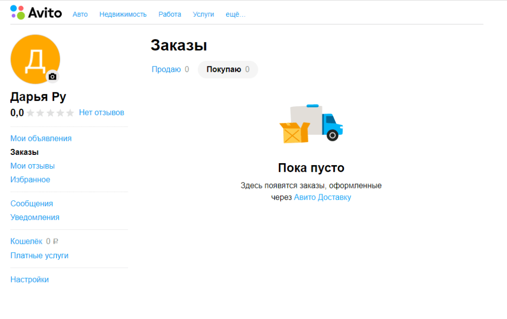 Перейдите в свой профиль Авито, откройте раздел “Заказы”: